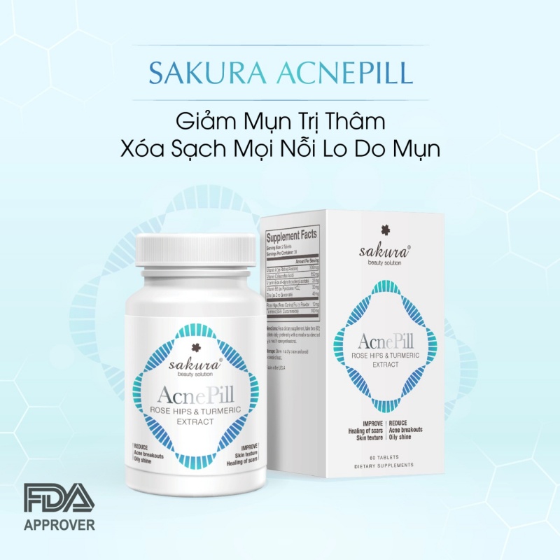 Viên uống giảm mụn, mờ thâm Sakura AcnePill cam kết 100% thành phần chiết xuất từ thiên nhiên, an toàn cho làn da bạn. Hơn thế nữa, sản phẩm ở dạng viên uống giúp tác động và thuyên giảm các tác nhân gây hại từ bên trong, mang đến kết quả nhanh chóng và lâu dài cho làn da bạn.