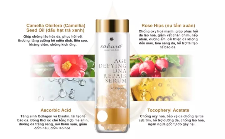 Bên cạnh hai thành phần chính là chiết xuất dầu hạt Trà Xanh và tinh chất Nụ Tầm Xuân, serum chống lão hóa Sakura Age Defying DNA Repair còn bổ sung thêm hai thành phần bổ trợ là Ascorbic Acid và Tocopheryl Acetate cho công hiệu tái tạo tế bào da mạnh mẽ gấp đôi những sản phẩm serum khác trên thị trường.