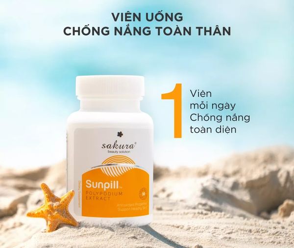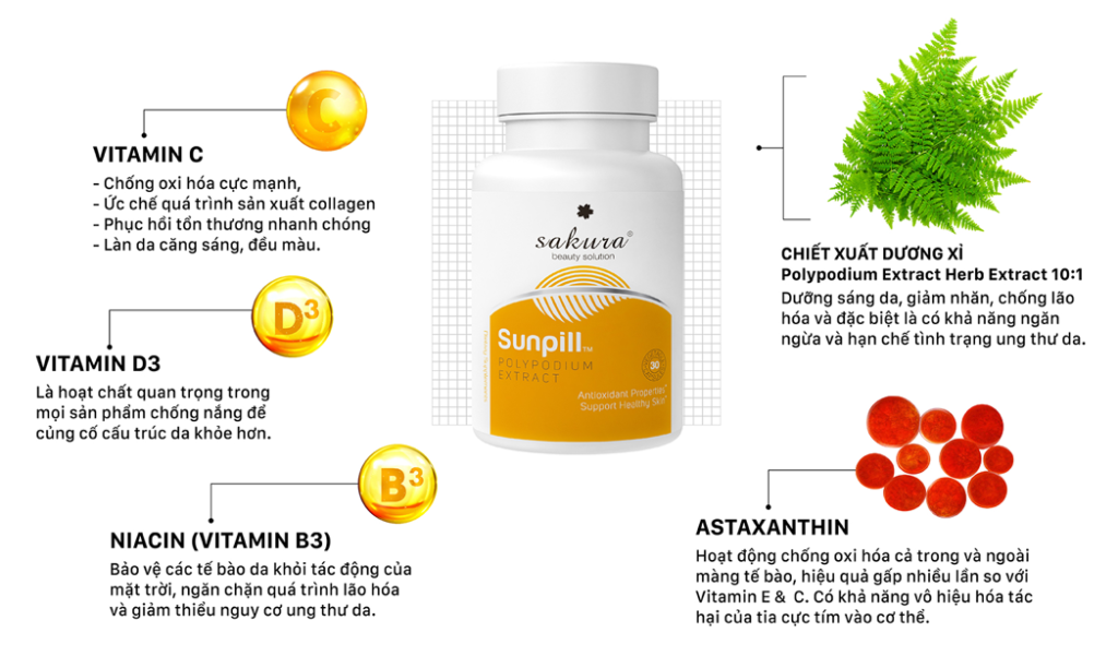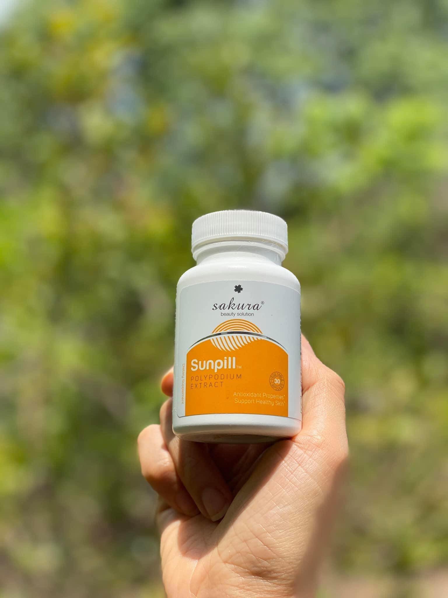 - Sakura Sunpill là viên uống chống nắng sinh học toàn thân được chiết xuất từ cây dương xỉ lên đến 5000mg, được ví như một loại kem chống nắng bằng đường uống mang lại hiệu quả chống nắng toàn body.