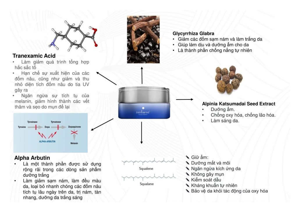 Các nhà khoa học tại viện nghiên cứu Sakura đã biết kết hợp các thành phần ưu việt Tranxemic Acid, Alpha Arbutin, Squalane, chiết xuất thảo đậu khấu, rễ cây cam thảo…